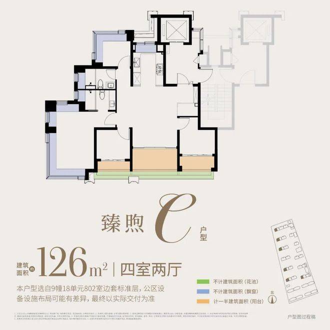 约126㎡4房:四开间朝南,附赠约30㎡,西边套一线临河,可享IMAX级观河景体验,全维度契合改善家庭的居住期待。