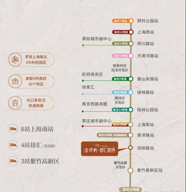 3站紫竹、4站徐汇,可换乘1号线通往徐家汇、新天地;未来19号线建成后,在景洪路站换乘可4站前滩、6站后滩,直达陆家嘴等CAZ核心。