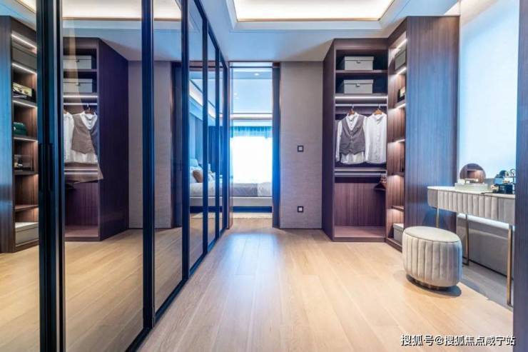 卧室方面,主卧衣帽间采用意大利高端定制衣柜品牌LEMA的Open系列,这家品牌创办至今已有50年的历史背景,材料上使用玻璃背板加金属框架的玻璃层板,柜体使用的落叶松色板材,整体设计感低调奢华,专为高端住宅量身定制的衣柜。