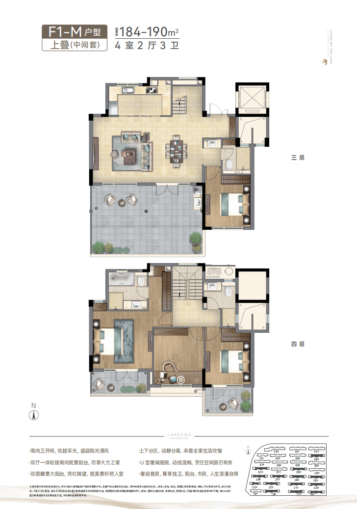 新亚洲洋房融合坡屋顶、深挑檐等中式元素,配以大面落地窗和蓝灰色LOW-E玻璃,让阳光洒满每个角落,营造出宁静淡雅的居住氛围。