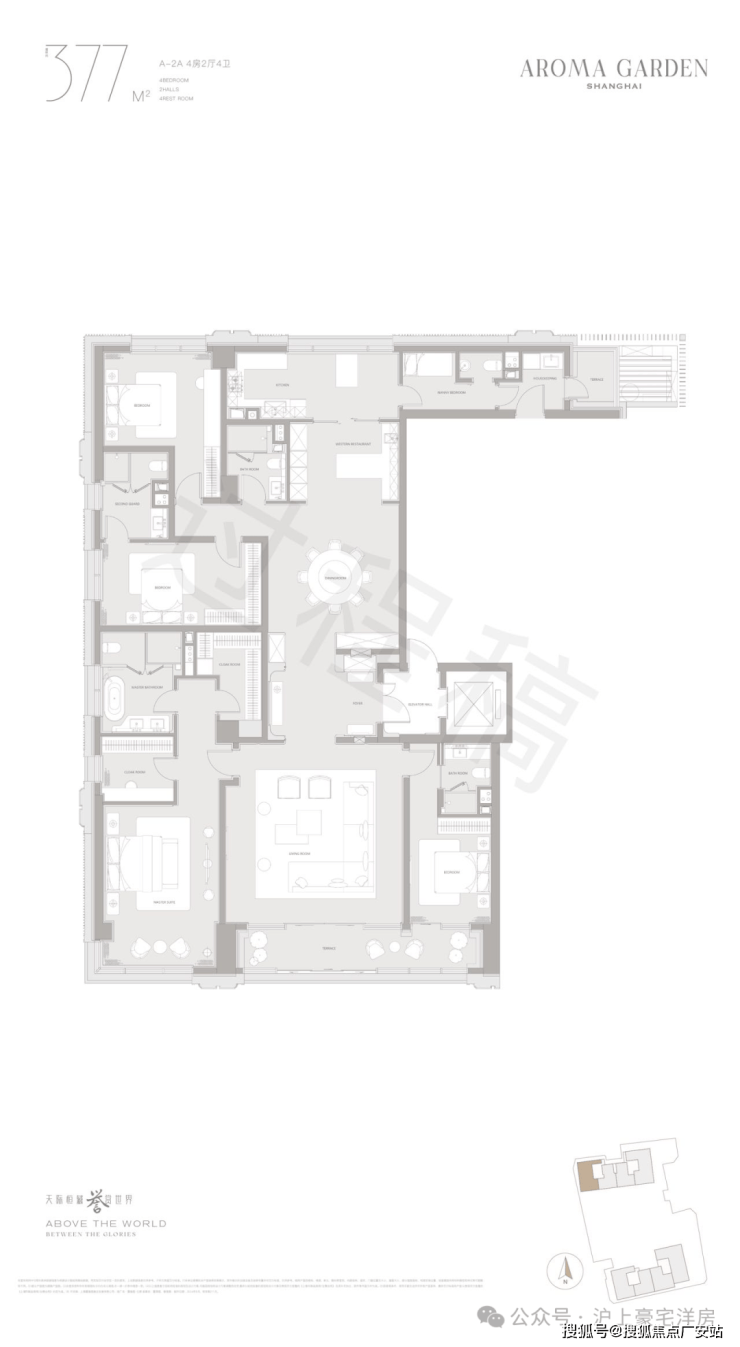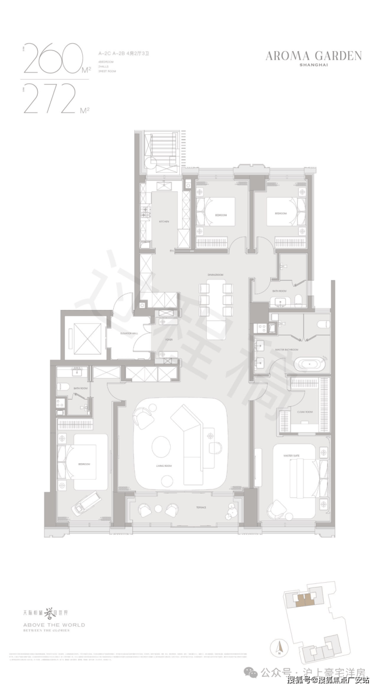 高层户型规划主力面积在260-882㎡区间。豪华主卧套房设计(部分户型为全套房设计),逾百平方客餐厅一体+270度转角落地窗+超宽尺度花园阳台,臻选智能化家居系统及世界顶级精装品牌,赋予居家艺术与智慧生活全新表达。