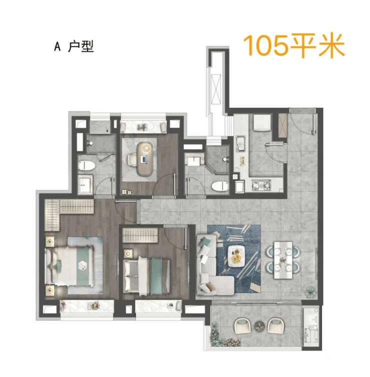 以 99㎡三房两厅两卫户型为例,客餐厅连接景观阳台,采光面更大,为日常生活带来更多舒适感,双卫设计更为生活增添便利。105㎡三房两厅两卫户型,客餐厅与阳台一脉相连,居住空间感进一步扩大,约 5.1 米的宽厅,无论是日常休憩还是会客,都尽显大方得体。此外,项目中央空调、地暖、新风三大件配套齐全,且臻选大金等同级品牌空调地暖、老板和方太等同级品牌厨房配备、摩恩、弗兰卡、科勒等同级品牌卫浴配备 ,每一处细节都彰显着对居者的用心,为您打造高品质的居住环境。