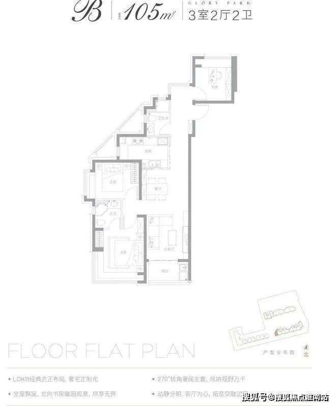 建面约 105㎡三房两厅两卫:采用经典南北通透格局,客厅开间约 4.2 米,搭配同等尺度景观阳台,三个卧室均带飘窗,主卧为独立套间,得房率高达 74.4%-79.3%。