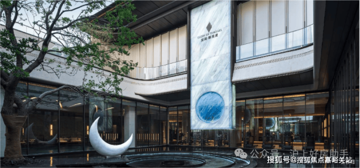 深藏于建筑怀抱之中的下沉式「琉璃光院」,是历经数十版方案淬炼出的灵魂之作。御湖境标志性汉白玉玄月族徽,与高10米的蓝水晶奢石光幕,共同演绎“日月同辉”的震撼场景。庭院深处50年乌桕树王矗立。