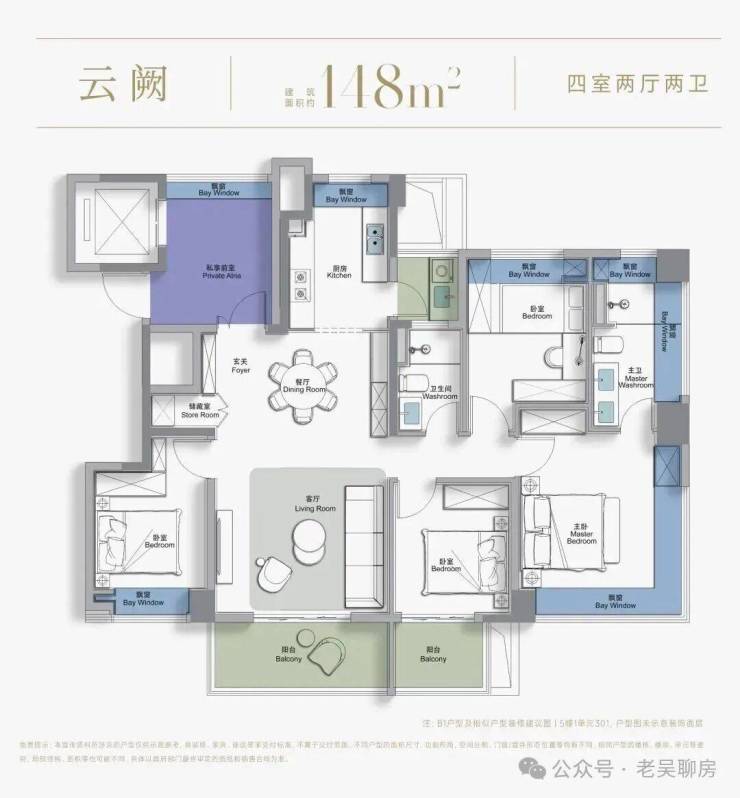光着3个阳台的面积就高达约15㎡,还有5个飘窗,这个套内可实际使用的面积可能堪比曾经约140㎡左右的大户型了。