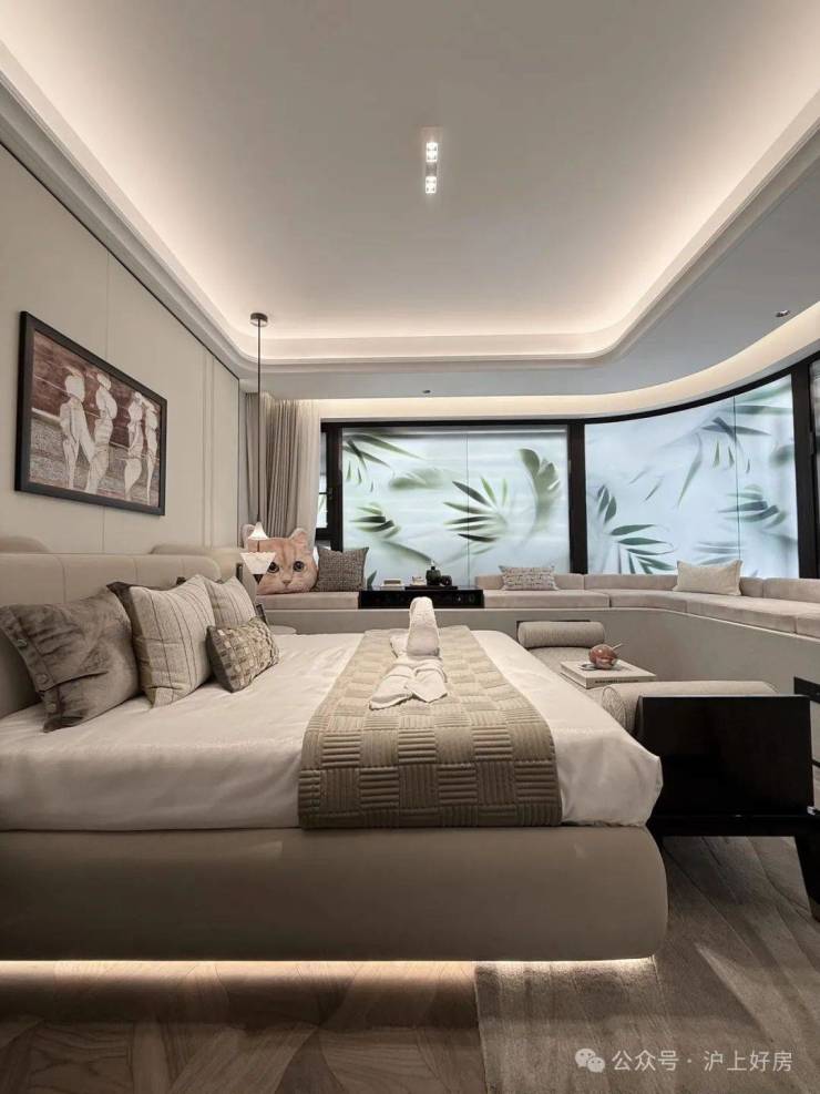 在今年上半年大家都在卷人字拼地板的基础上,外滩源著主卧地板升级为柳叶拼接,进一步做了升级: