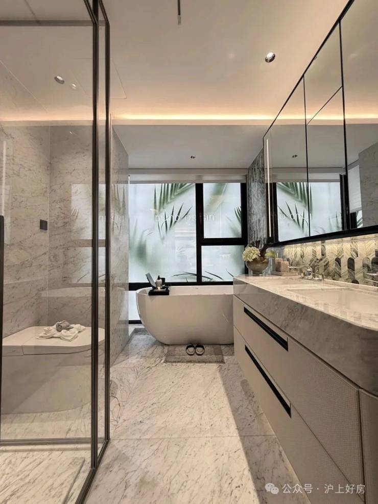 基础硬件都不差,🌨 中建壹品 外滩源著售楼处热线☎️☎️:400-9966-940🌊🌊项目在审美上还做了不少创新——卫生间大量采用奢石和石材,比如主卫柜体墙面就是香格里拉翡翠拼花,龙头是冷热分离式,成本更高: