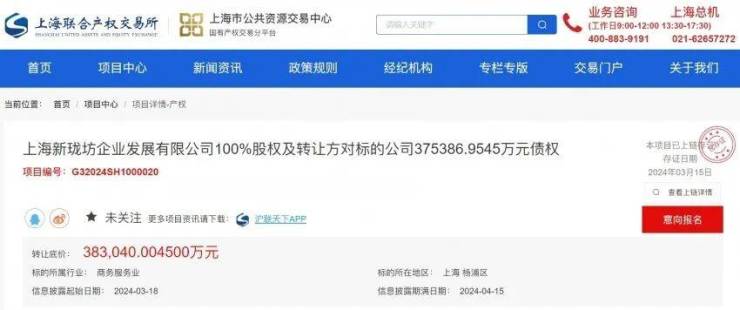 3月15日,上海联合产权交易所官网发布信息,上海新珑坊企业发展有限公司100%股权及转让方对标的公司375386.9545万元债权正式挂牌转让,其中转让方上海新珑坊企业发展有限公司由上海杨浦城市更新建设发展有限公司(下称“杨浦城更”)100%控股,杨浦成更所属集团为上海地产(集团)有限公司。