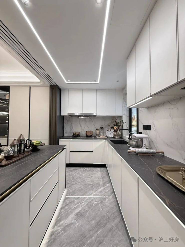 收纳空间全部都是来自博洛尼专属定制(或同等品牌),真正做到拎包入住、省去后期定制比价的烦恼;而在收纳空间之外,外滩源著在用料上同样可以称得上卷王——项目厨房台面是全进口的西班牙DEKTON品牌: