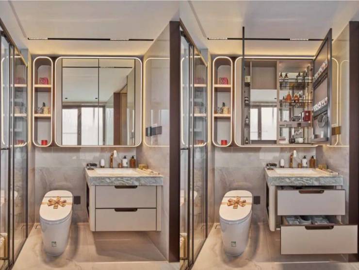 譬如说部分柜体更安全的圆角处理、高柜顶部一窥到底的镜面反光膜、大大提高空间利用的薄抽,不用弯腰一踢即开的踢脚抽设计,便利性大大增加;每一个细节都充分考虑到了未来居住的舒适性,这种产品颗粒度真的令人惊艳!