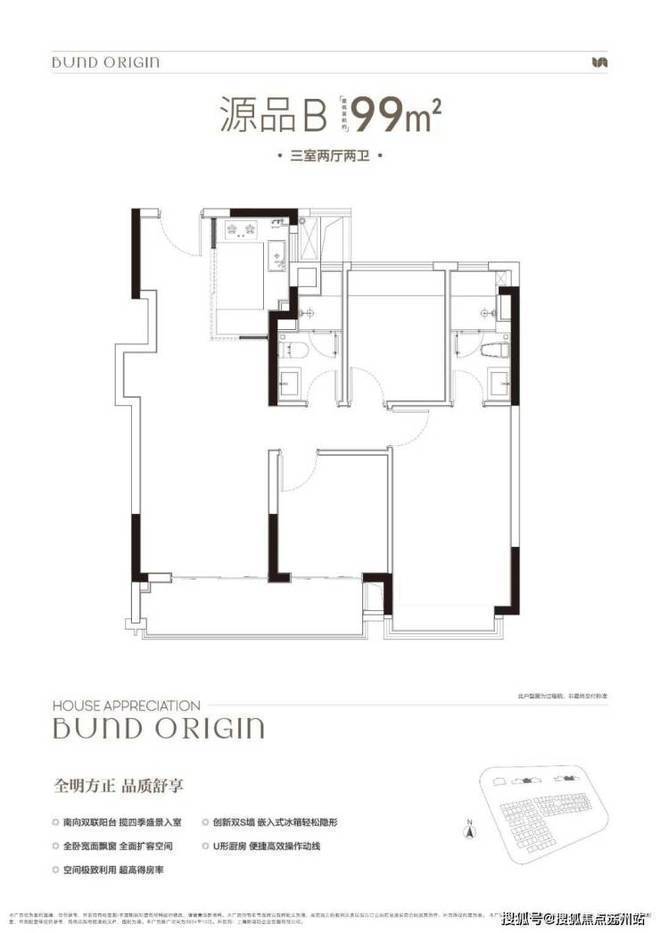 B户型是3房2厅2卫格局,三开间朝南+LDKB一体化+奢阔宽厅+全卧室带飘窗+主卧套房设计+动静分离+主卧270度飘窗,舒适度更高。外滩源著 复兴里 售楼处电话:400-8787-740