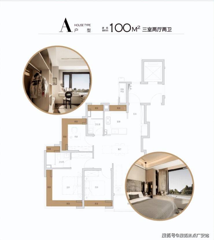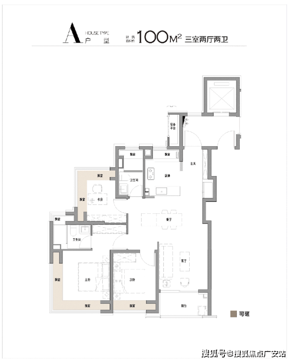 100㎡户型,双270°飘窗设计(南向主卧+北向书房),南次卧、厨房、双卫飘窗,厨房烟道外移,飘窗配置抽屉,极致空间利用率。