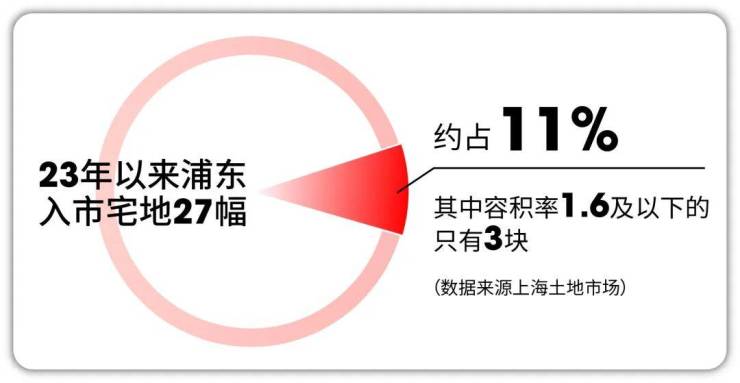 据上海土地官网显示,2023年至今整个浦东入市宅地27块, 其中容积率1.6及以下的只有3块,占比仅约11% ,其中之一就是金海雲墅。