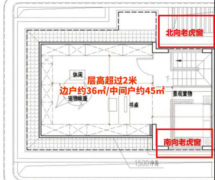 ⑥、项目的所有上叠产品,都 规划了层高超过2米的灵动空间 (因屋顶造型因素,边户约36㎡,中间户约45㎡)。