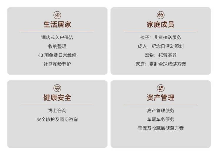 空间设计的目的是将空间交还给人,承载生命的欢愉与丰盛。古北99以前瞻性的视野,对古北的生活方式进行深度迭代升级,汲取世界奢华酒店基因,从时间、空间、私属三个维度出发,依据280余项标准化服务细则,打造自然无痕的服务内容;并充分考虑当代高净值业主需求,提供日常居家服务、健康安全、资产托管等增值服务,如入户保洁、儿童校车点接送、宠物托管、工程43项免费日常维修等,妥帖照顾每个生活细节。