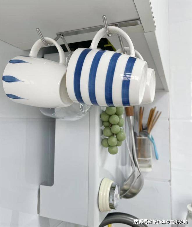 比如吊柜底部,安装挂钩当杯架、厨具挂钩,筷子篓也是贴在墙面上,尽量减少在台面空间放置的物品,节省空间的同时也方便平时用抹布擦拭台面。