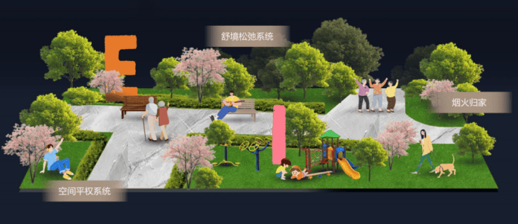 联发·时光新澍以 “全场景松弛系统” 为核心,将景观划分为静音治愈、亲宠陪伴、自在休憩、街角松弛等四大功能场域