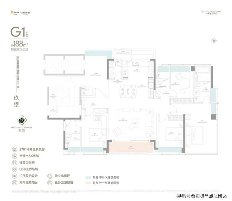 独立电梯厅+四开间朝南+双套房设计+豪华主卧的约270°无柱转角飘窗,整个户型的尺度感拉满