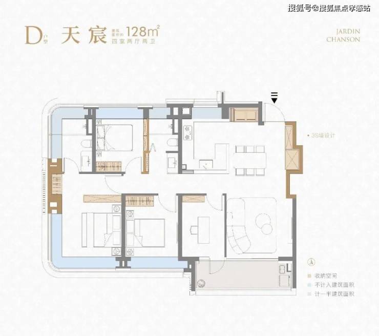 延续了3S墙和双270°全景双舱的亮点,尺度感进一步提升。南向四开间保证了更充沛的阳光,客餐厅与超大尺度阳台贯穿南北,进门视野无遮挡,大宅气度油然而生。