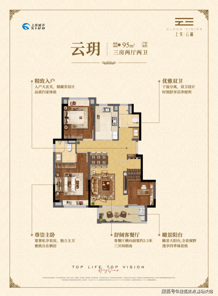 约95㎡三房两厅两卫,做到了三开间朝南+瞰景大阳台+主卧套房设计+南北通透+卫生间干湿分离,该户型得房率和空间利用率都非常高。