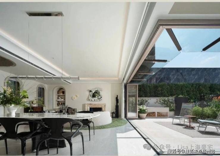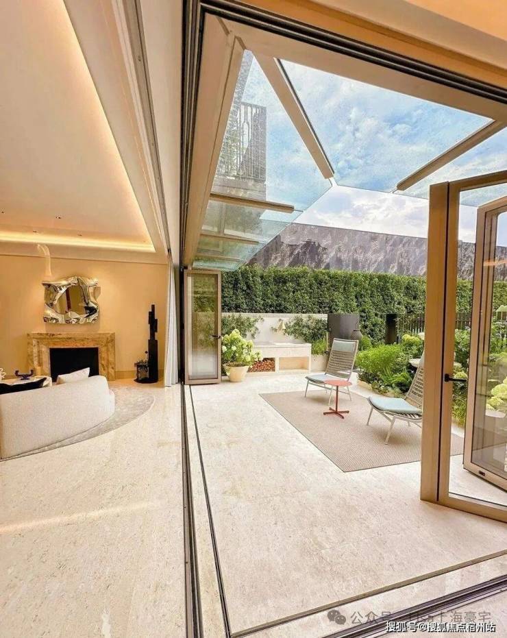 「无界空间」:客厅270度转角无柱设计,搭配落地玻璃,开阔视野将院中风景迎入日常。