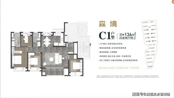 C1户型:建筑面积约136㎡四室两厅两卫: