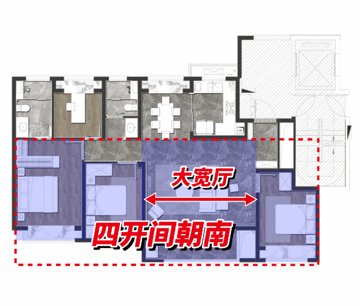 四开间朝南+大宽厅设计,让该户型实际享受到的是4.5房的空间体验,阔绰的客厅面宽足够多塞下一个公共空间!