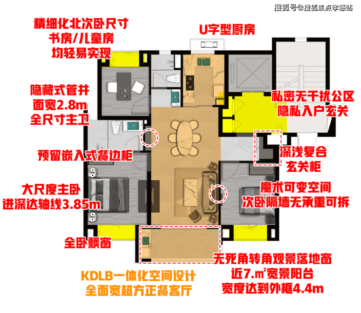 入户玄关及超大玄关柜设计,三开间朝南飞机户型, KDLB一体化设计,客厅次卧魔术可变空间,U型厨房,大尺度宽景阳台+转角观景落地窗,舒适北卧,三段式干湿分离客卫,全卧室飘窗,等等