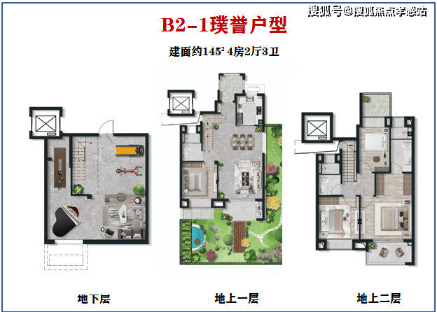 面积上与B1-1户型相同,建面约145㎡,功能区也大致相似。