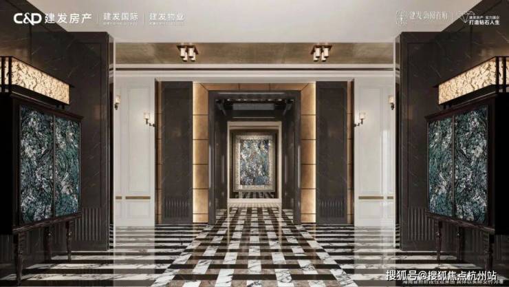 项目整体在外观上非常庄严大气,超10米的整块复古黄铜锤纹牌匾上,写着【建发海阅首府】6个大字,这经典的阵列柱式,有没有让你想到什么?
