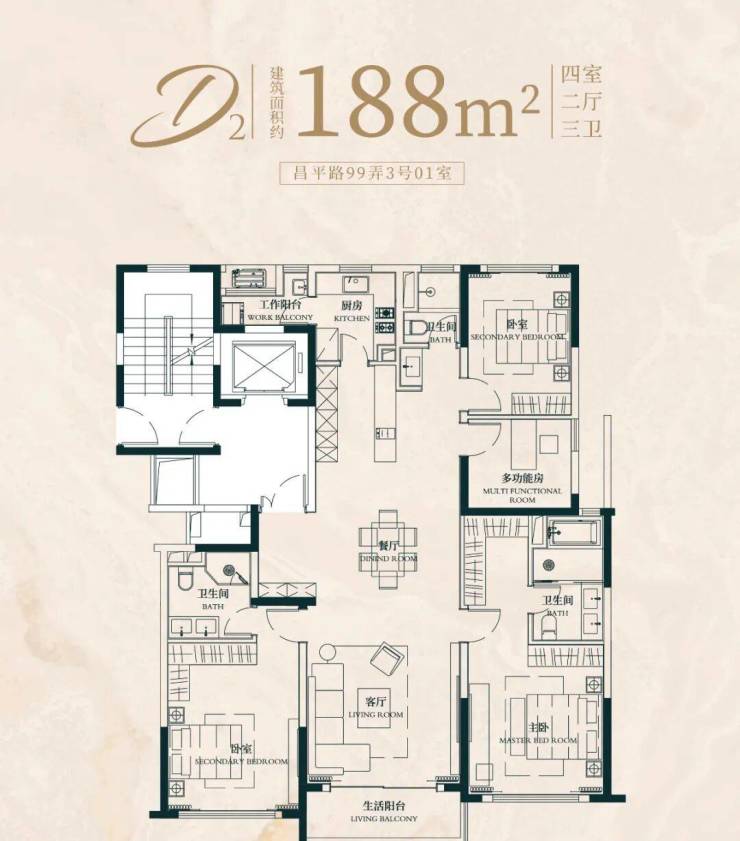 建面约183㎡4房2厅2卫户型: