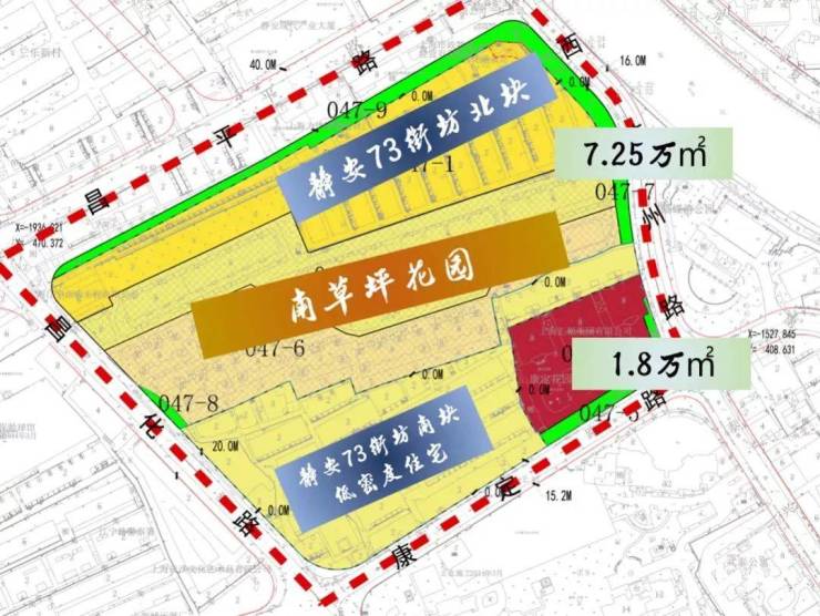 静安73街坊项目共分为南北两个地块,中间被现有的住宅隔开。