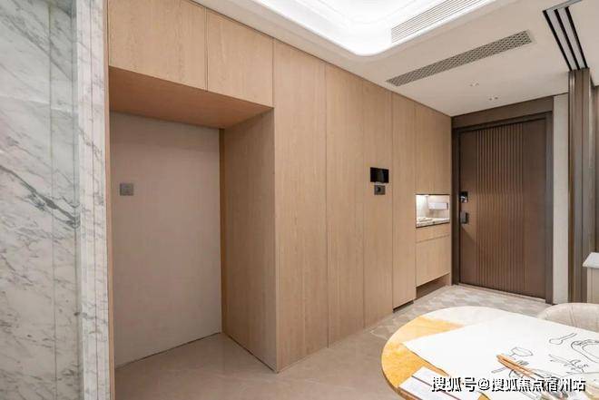 值得一提的是,整个玄关柜是天然木皮鸡翅木包裹,用料昂贵。并且与墙面、地板几乎一个色系,营造一气呵成的视觉观感,商序售楼处电话400-8787-740 传递出一种低调内敛的豪华感。