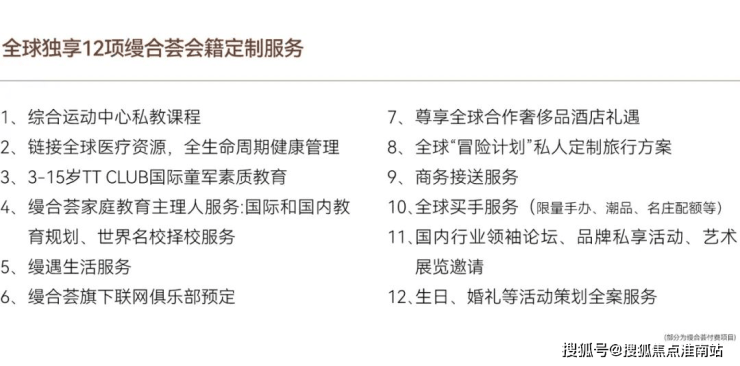规划社交、商务、运动、志趣、亲子5大主题,涵盖精致私宴、恒温泳池、健身房、儿童培训、咖啡休闲、多功能厅等,并链接12项全球顶级资源,从运动、教育、旅行、医疗等多维度,同频时代前沿的国际资源,以豪宅圈层塑造难以超越的资产价值“护城河”。