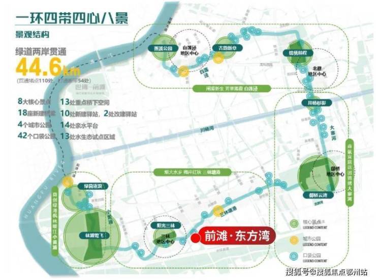 周边前滩友城公园、前滩体育公园、东明公园等已建成公园,三林塘港、“林浦莺飞”、“绿茵逐浪”等核心景点将连缀成片,形成气势磅礴的滨水公园带。