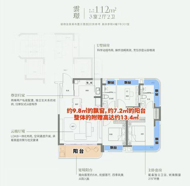 第一,这个户型有约9.8㎡的飘窗,约7.2㎡的阳台,整体的附赠高达约13.4㎡。这是目前上海外环沿线,是附赠率最高的一个小高层产品。