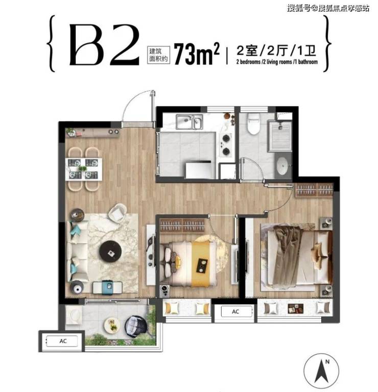 这个建面约74㎡户型非常通透,基本上南北能开窗的部分都开了窗,所以采光和通风都很棒;
