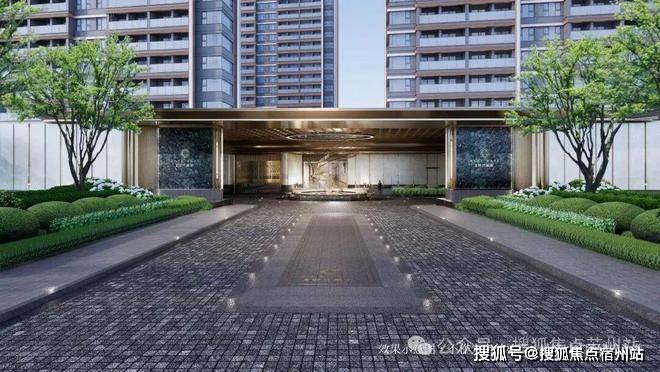 酒店式社区入口,设环岛落客区,高定入户大堂,设飘顶弧形雨棚,顶部采用香槟金色的斜角造型铝板,搭配手工打磨的星空顶及氛围灯,地面铺设仿石砖,墙面基调则借鉴了华尔道夫酒店的浅米黄色系大理石,并配以精致的礼仪灯设计。