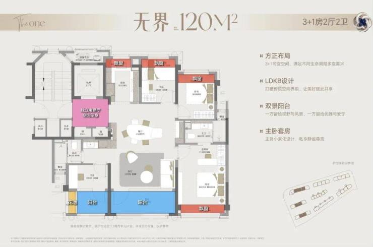 双阳台+多飘窗+花池+独立电梯厅将户型实得率提升到90%+。