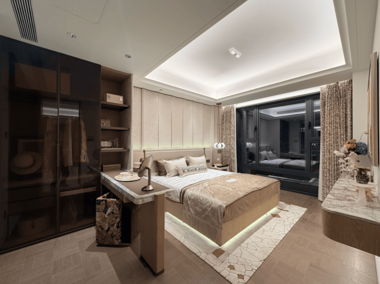 主卧与一个北次卧是270°转角飘窗,结合楼栋南侧一线沿河的优势,进一步提升了室内的视野、采光效果。