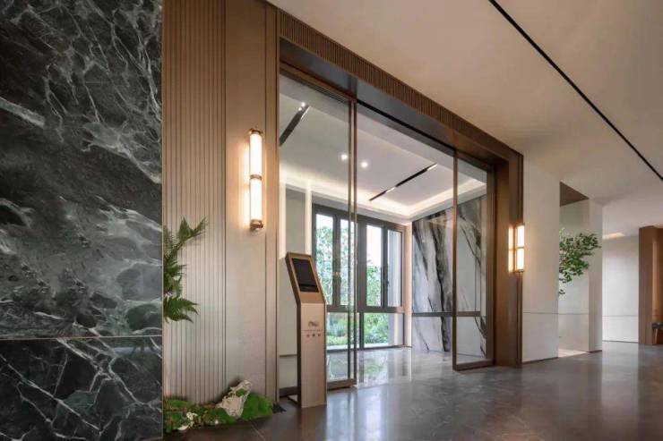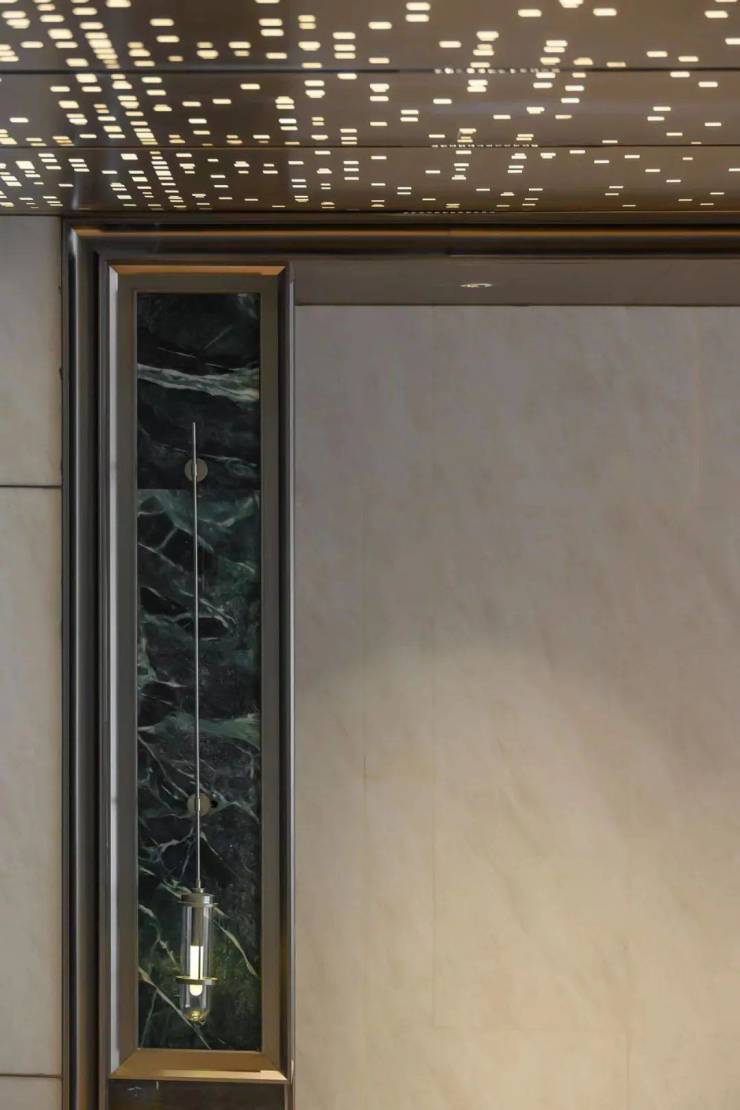 架空层入户门厅处,以普拉达绿奢石为背景装饰,提升了整体空间的质感,结合金属铝板装饰搭配,归家仪式感满满。☑️☑️映翠府售楼处电话:400-8855-420☑️☑️