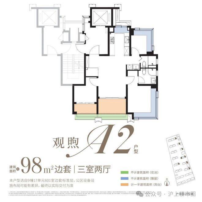 约98㎡3房:类一梯一户、全屋飘窗为标配,双阳台+景观花池是核心亮点(市面双阳台户型起步多为约110㎡),整体附赠约23㎡,是罕见的高实得率精致户型。