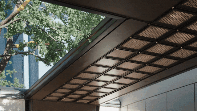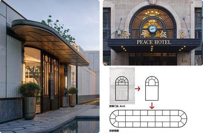 吊顶雨棚纹样来源于上海和平饭店主入口花窗,设计选取其主入口的花窗作为纹样的源头,通过抽象化的艺术处理手法,将经典元素融入现代设计之中,赋予新建筑以深厚的历史底蕴,对海派文化及其象征性符号表达传承与致敬。