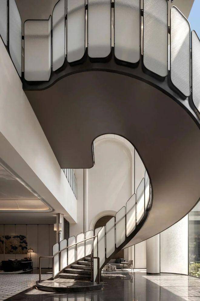 艺术楼梯的设计灵感来自于老洋房中经典的曲线形制,运用精巧简约的现代设计理念,将海派风格的弧形金属线条与富有质感的艺术玻璃巧妙结合,塑造出一种优雅而时尚的形象。