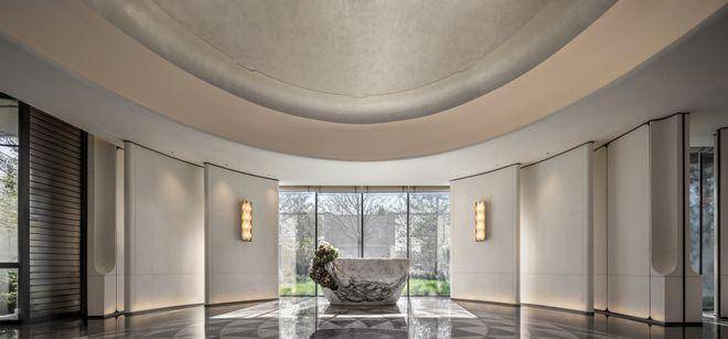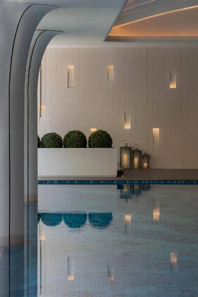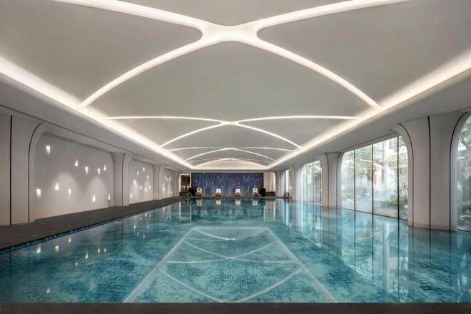室内空间与建筑美学一脉相通,承袭三林非遗文化与海派语汇。艺术馆般的泳池天花以及泳道尽头的景泰蓝奢石背景墙面,打造现代摩登的低调奢华,勾勒出一处至臻奢享、静感舒悦的精神之所。