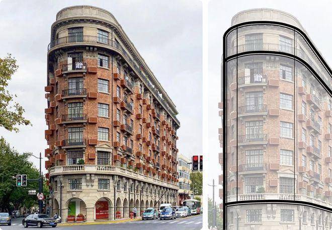 弧形玻璃强化了空间的流动性与通透感,通过光线的折射与反射,为建筑内部带来不断变化的光影效果。实体的片墙与虚幻的玻璃体的对比,代表着过去的厚重与未来的通透,以重新摹写邬达克的方式融合,在刚性与柔性之间演绎新海派。