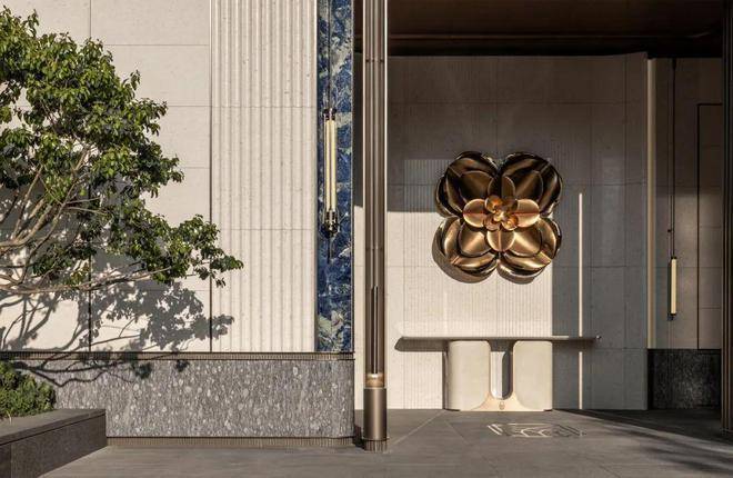 设计师对材料的工法和模数进行了细致的研究,根据不同的部位呈现不同的变化。石材分缝、金属嵌条均通过精心排列与设计,不仅强化了建筑的线条感与层次感,还巧妙地融入了装饰艺术元素,展现出精致与时尚并重的视觉效果。