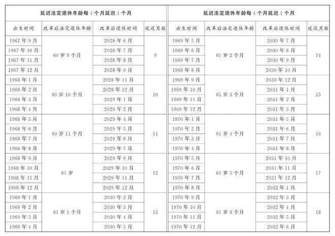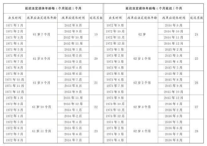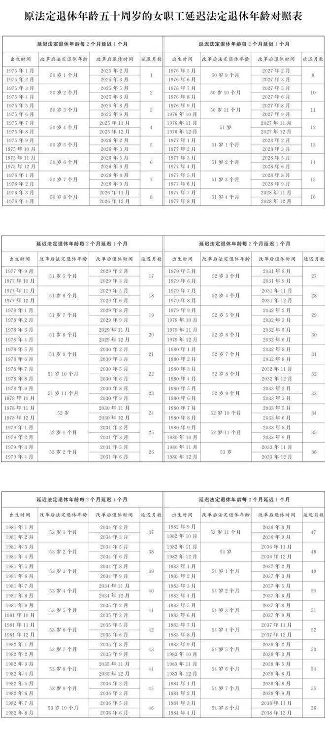 2025年1月1日起,原法定退休年龄为60周岁的男职工和原法定退休年龄为55周岁管理、技术岗位的女职工,法定退休年龄每四个月延迟一个月,分别逐步延迟至63周岁和58周岁;原法定退休年龄为50周岁工人岗位的女职工(不包括事业单位在编的干部身份的女职工),法定退休年龄每二个月延迟一个月,逐步延迟至55周岁。