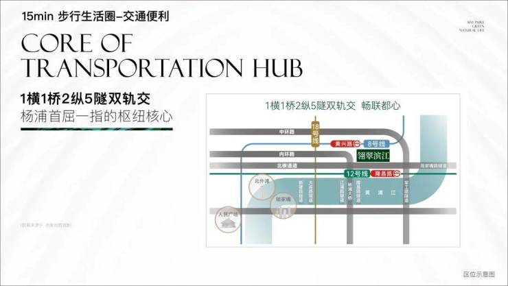 地铁:约900m8号线黄兴路站;约600m至12号线隆昌路站,5站陆家嘴,16条换乘通达全城