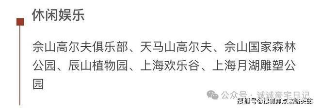 休闲:佘山国家森林公园、广富林遗址公园、月湖雕塑公园、欢乐谷、玛雅水上乐园、佘山高尔夫等环绕四周。
